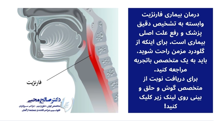 - تشخیص افتراقی: پزشک در تشخیص، باید بیماریهای دیگری که علائمی مشابه فارنژیت دارند مانند التهاب لوزهها (التهاب لوزه کامی تونسیلیت)، آلرژیها یا مشکلات ساختاری حلق را نیز مد نظر قرار دهد.
