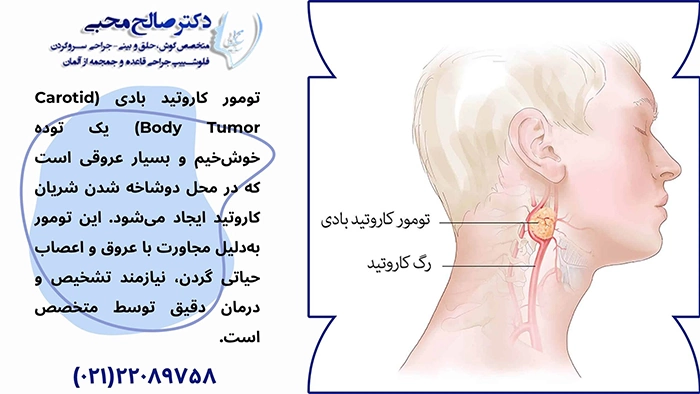 تومور کاروتید که با نامهای دیگری مانند توده عروقی کاروتید، پاراگانگلیوما کاروتید یا توده بادی کاروتید شناخته میشود که در ناحیهای از گردن، در محل انشعاب شریان کاروتید داخلی و خارجی، ایجاد میشود. این تومور از ساختاری طبیعی به نام جسم کاروتید (Carotid body) منشأ میگیرد؛ گیرندهای حساس به میزان اکسیژن و دیاکسیدکربن خون که نقش مهمی در تنظیم تنفس دارد. اگرچه رشد تومور کاروتید معمولاً آهسته است، اما به دلیل نزدیکی به شریانهای حیاتی و اعصاب گردن، در صورت بزرگ شدن میتواند باعث فشار بر بافتهای اطراف شده و مشکلاتی مانند تغییر صدا، اختلال در بلع یا درد گردن ایجاد کند. به همین دلیل، درمان تومور کاروتید باید جدی گرفته شود.